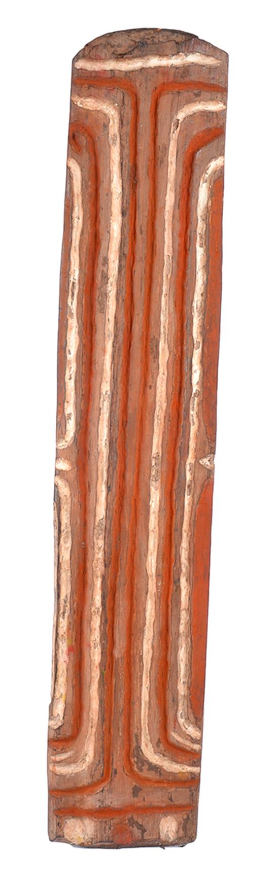 A ELI REGION WEST PAPUA CEREMONIAL SHIELD, deeply carved grooves painted in natural mineral colours, 135.5 x 26.5cm