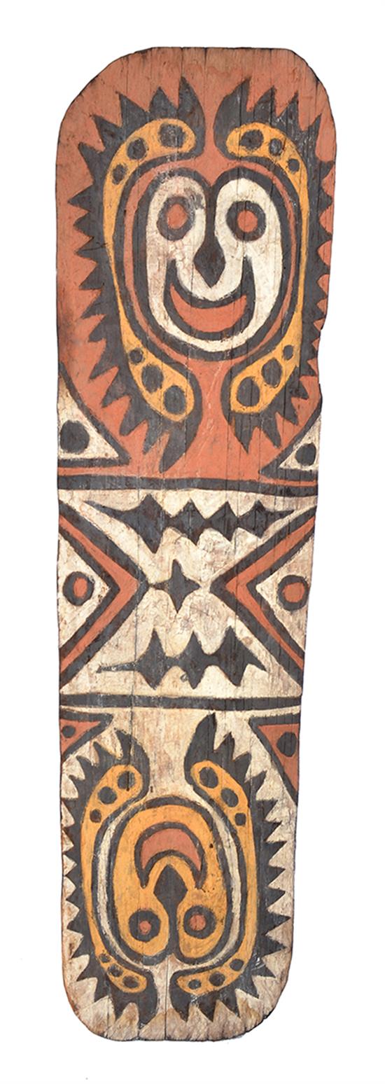 A MAY RIVER MENS HOUSE DISPLAY SHIELD, with typically deeply carved ancestral faces and motifs, 147x 43.5cm