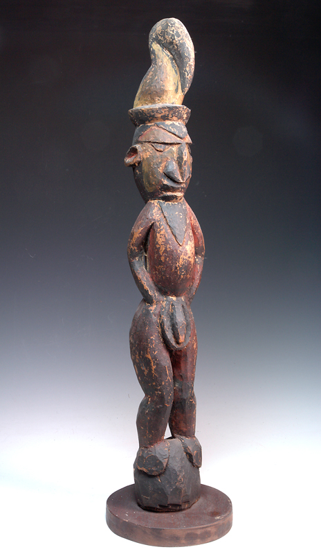 A MAPRIK REGION ANCESTOR FIGURE, with a bird on its head, hands at thighs, on wooden stand, 64.5 cm high