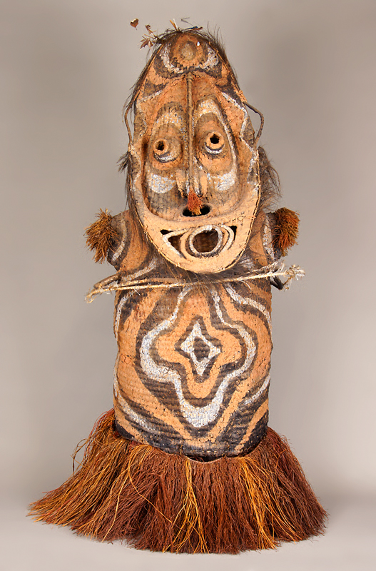 A NANGISSAP VILLAGE TUMBUAN DANCE COSTUME, PNG, large face with protruding eyes, rattan girdle with loops for insertion of flowers/leaves, raphia fringe underneath and around armholes, 125.5cm with fringe