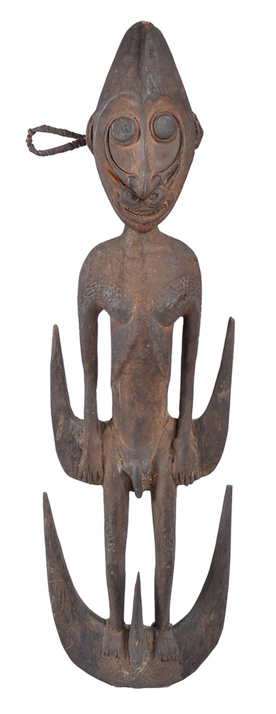 A MIDDLE SEPIK SAWOS TRIBE SUSPENSION HOOK, KANGANAM VILLAGE, carved tattoo marks on breast and along back, stylised birds head on base, 121 cm high