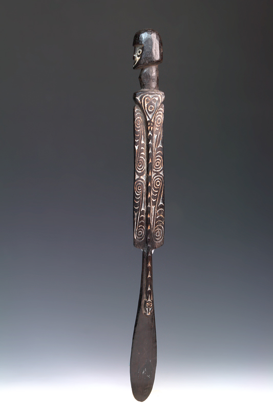 A MASSIM REGION LIME SPATULA, regional scroll motif carved on stem, figural finial