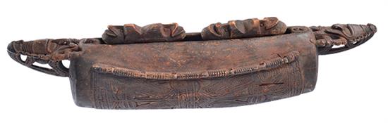 A LAKE MURIK GARAMUT DRUM, PNG, each finial an ancestor figure, drum standing on two supports each with two faces, 81cm long