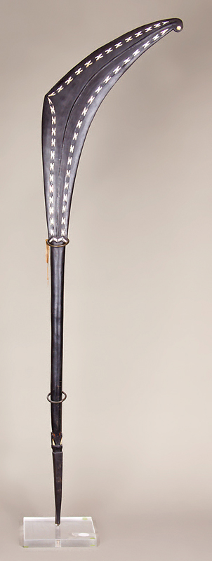 A LARGE SICKLE SHAPED SOLOMON ISLANDS PARRYING CLUB, with mother-of pearl inlay both sides, 119cm long