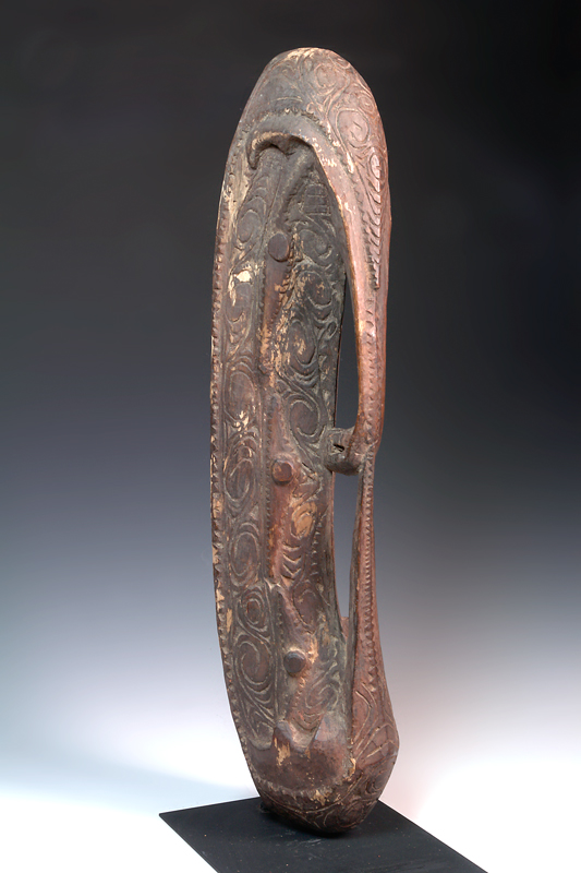 A MIDDLE SEPIK CULT HOOK, TWO HEADS OPPOSED, carved scroll motif all over surface, 69cm high