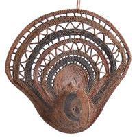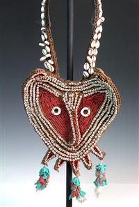 TWO YAM HARVEST MASKS, A DANCE WAND AND A PLAITED NECKBAND, the latter 53cm long