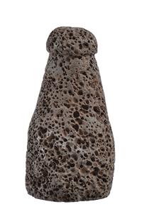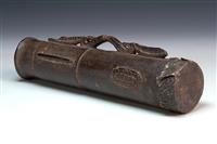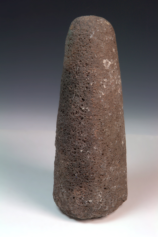 FOUR MELANESIAN OBJECTS, including Trobriand island finger drum, Solomon islands food vessel and two stone pounders. The drum 27.5 cm high