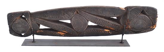 A MAY RIVER CANOE PROW DECORATION, carved decoration of eyes and seagrass, 73.5cm long