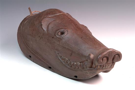 A LARGE PNG PIG FESTIVAL DANCE MASK, pigs head, edged with perforations for bilas decorations, carved teeth & tusks along snout, 45.5cm long