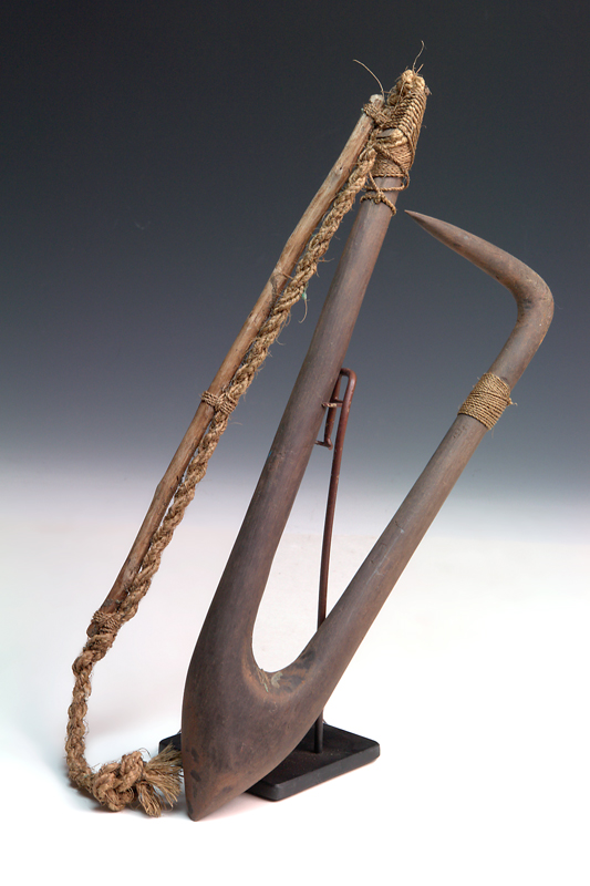 A MORTLOCK ISLAND FISHING HOOK, carved wood, lashed with vegetable fibre, 27cm long
