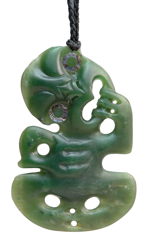 A MAORI GREENSTONE TIKI, NEW ZEALAND, paua shell rings around central pupils, circa 1960, 8cm long