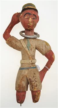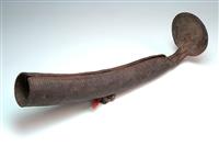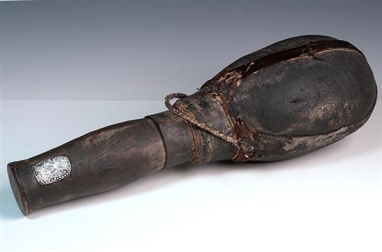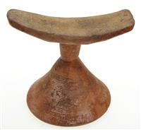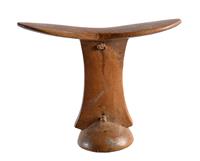A COLLECTION OF AFRICAN OBJECTS, including Masai tribe calabash, Tanzanian woodcut print, Senufo tribe percussion instrument, Turkana tribe neckrest, Baule tribe carved legionnaire figure and Ethiopian neckrest, the latter 12cm high