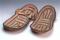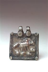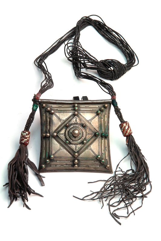 A COLLECTION OF FOUR AFRICAN TRIBAL BODY ORNAMENTS, including Chamba tribe pendant, Nkole tribe sandals, Tuareg tribe padlock and silver amulet