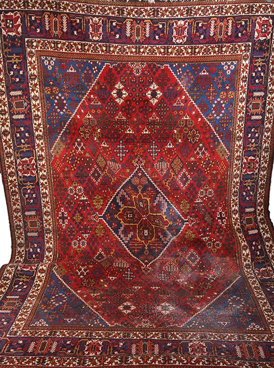 A LARGE PERISAN RUG, red, blue and cream ground, geometric and floral motif, 323 x 219 cm