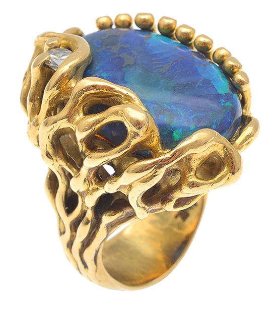 Of free form design, centrally set with an oval matrix opal displaying blue, green and violet play of colour, offset by a single brilliant cut diamond of 0.15cts, mounted in 18ct gold, ring size L.