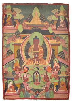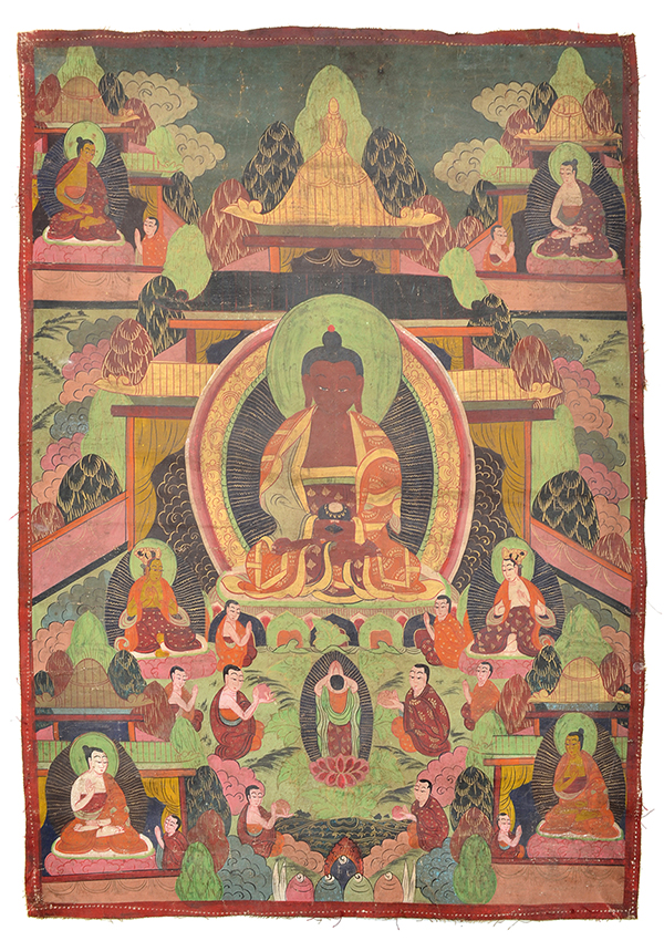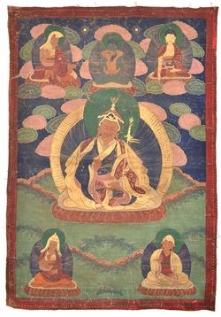 each hand painted on canvas, in stylized roundel surrounded by attendants, depicting Padmasambhava and Buddha