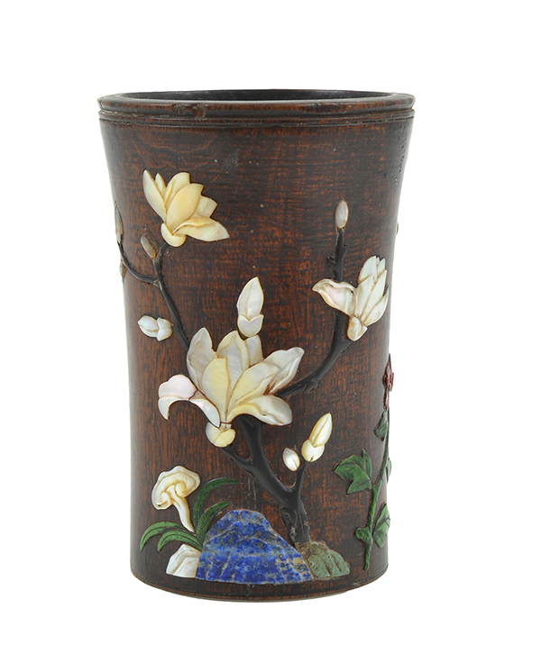 A MOTHER OF PEARL INLAID WOODEN BRUSH POT