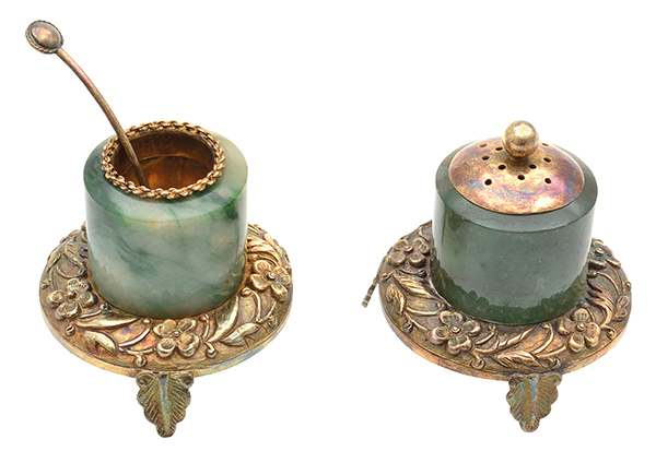 two cylinder jadeite stones of lovely translucent green glaze set into a silver frame, the small spoon and the lid are gilt silver, together making a fine condiment set for the western market, the pepper 5.5cm high, salt 6cm high with spoon