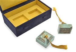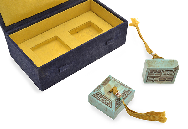of square-section, each with incised chop face, surmounted with seed pearls and silk tassels, with fitted box, the tallest 3.3cm high