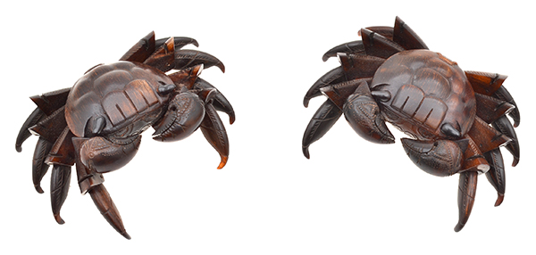 A PAIR OF HORN CARVED AND ARTICULATED CRABS