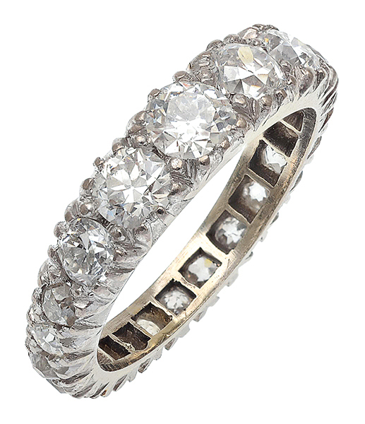 The full circle band of tapered design, set with early round and old European cut diamonds, mounted in 18ct white gold, ring size N.