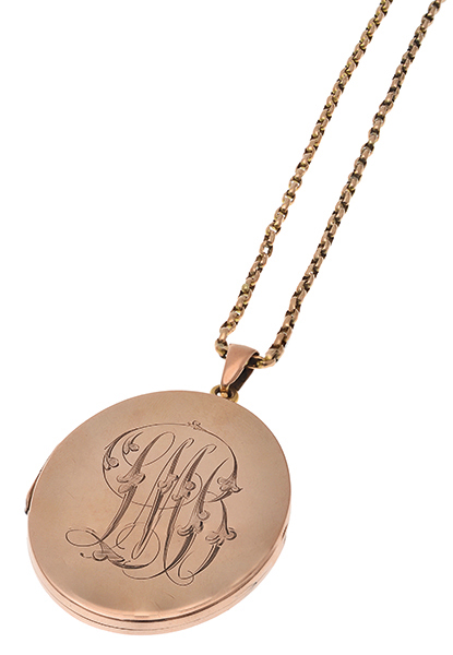 The oval hinged locket with polished finish and engraved initials, set in rose gold, signed Willis and Co, suspended from a belcher link chain in gold, total length 290mm.