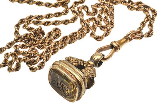 The rope twist chain in 18ct gold having a 15ct gold swivel clasp, suspended with a gold cased seal set with foiled back yellow paste, total length 1670mm.