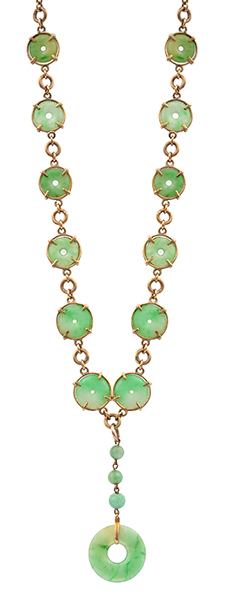 Comprising a necklace and a pair of earrings, featuring polished and pierced circular jadeite discs, the necklace having a larger jadeite drop, all mounted in 9ct gold, signed Rodd, total length 385mm.