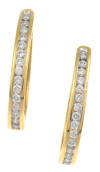 Each of oval hoop design, channel set with round brilliant cut diamonds, mounted in 18ct gold.