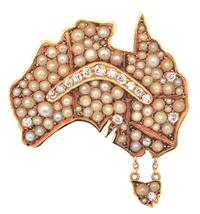 Modelled as the states of Australia, set throughout with seed pearls and having an old European cut diamond for each capital city, overlaid with a diamond set boomerang, signed, all mounted in 15ct gold.