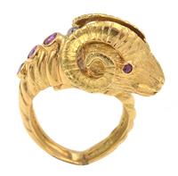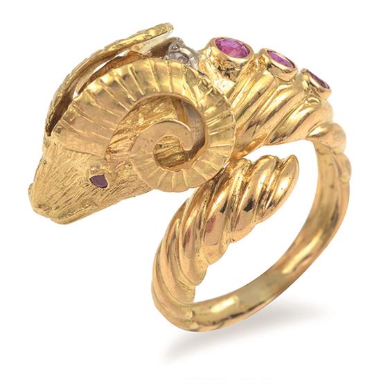 Modelled as a ram's head, set throughout with rubies and diamonds, reference A21, mounted in 18ct gold, signed, ring size K.