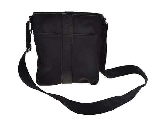 Styled in black canvas, with black leather trim and silver metal hardware, 23 x 27 x 6cm.