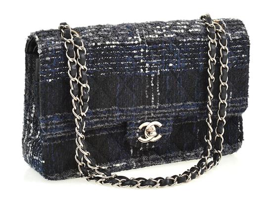 The double flap handbag styled in navy and black tweed, with silver metal hardware, authenticity card included 10037867, 26 x 15 x 6cm.