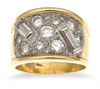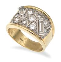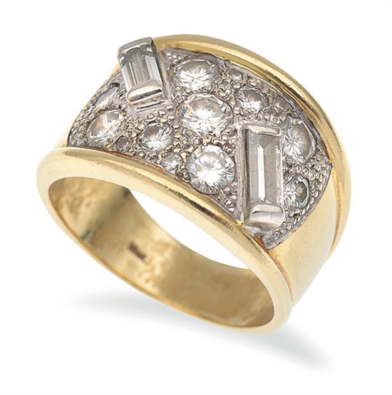 The wide tapered band set with baguette and round brilliant cut diamonds totalling 1.70cts, mounted in 18ct white and yellow gold, ring size O-P.