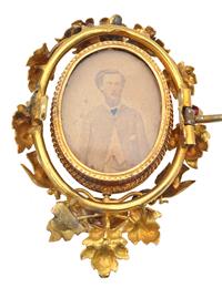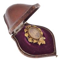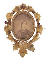 Featuring an oval glazed reversible portrait, set in a frame of leaves, flowers, birds and a nest, set with garnets and seed pearls mounted in 15ct gold, boxed.