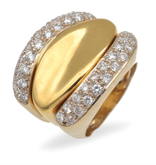 Having a central concave polished panel, flanked by two curved rows of pave set diamonds, mounted in 18ct gold, ring size O.
