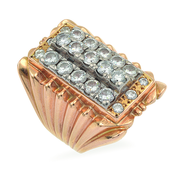 Set throughout with round brilliant cut diamonds in a geometric formation totalling 2.79cts, mounted in 18ct rose gold, ring size V.