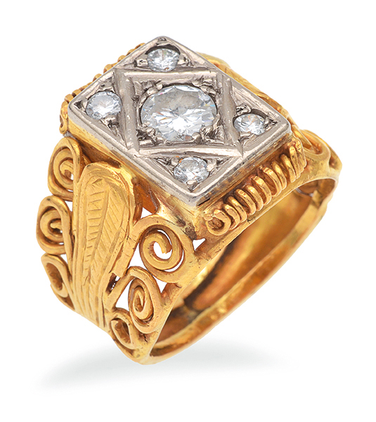 Centrally set with an early round brilliant cut diamond of 0.72cts, offset by four further diamonds in a geometric formation, mounted in 18ct white and yellow gold, ring size T.