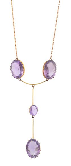 Set with four oval cut amethysts on a drop pendant, to a fine trace chain, all mounted in gold.