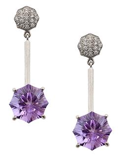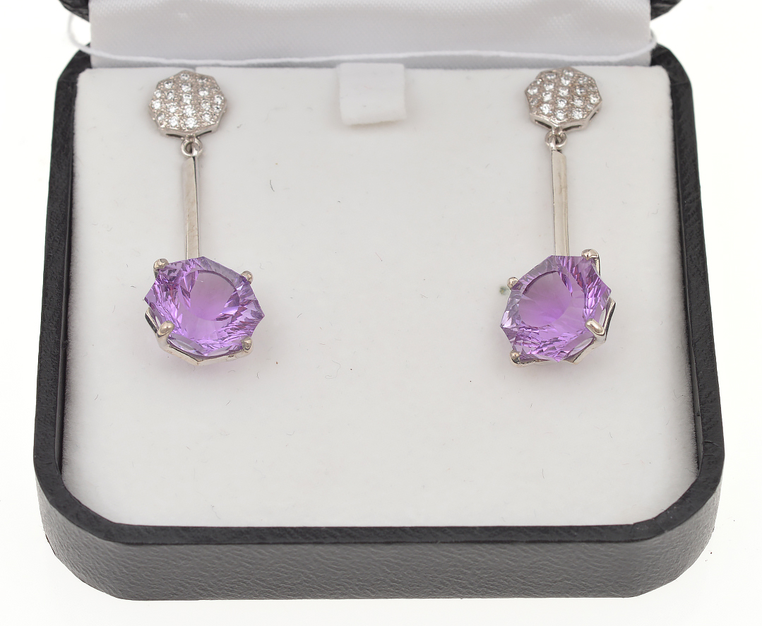 A PAIR OF DIAMOND AND AMETHYST DROP EARRINGS