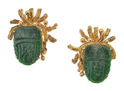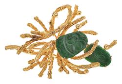 Comprising a brooch and pair of earrings, all set with carved and polished jadeite panels within a textured frame, mounted in 18ct gold.