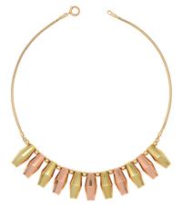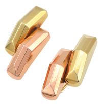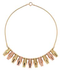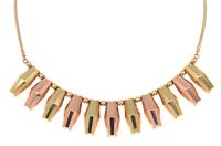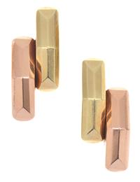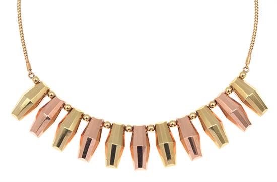 Comprising a necklace and pair of earrings, the necklace set with geometric convex fluted panels in 14ct rose and yellow gold, finished with a snake link chain, the earrings of conforming design.