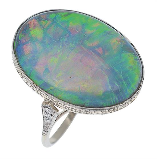 The oval solid black opal cut en cabochon having diamond set shoulders, mounted in 18ct white gold, ring size M.