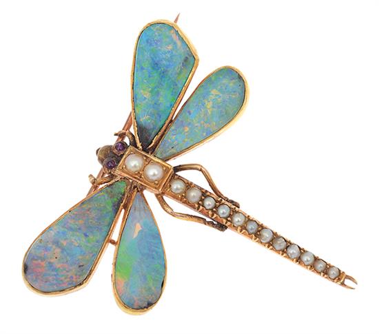 AN ANTIQUE OPAL AND SEED PEARL DRAGONFLY BROOCH