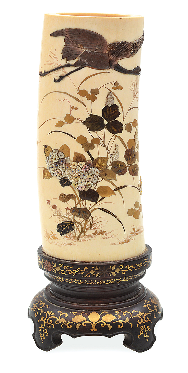elaborately lacquered and inlaid with floriate, insect and duck motif, mounted on gilt lacquered wooden base, 33cm total height (losses to inlay, one foot repaired)