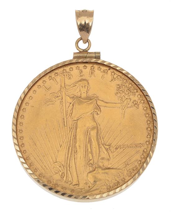 Featuring an American fifty dollar gold coin, mounted in a 14ct gold frame.