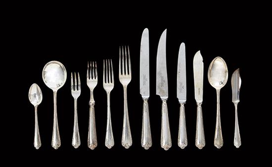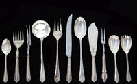 Comprising a full setting for twelve and accoutrements; 2 x large salad servers, 2 x small salad serving, 1 x serving spoon, 1 x large meat fork, 1 x small meat fork , 1 x fish knife and fork, 4 x serving spoons, 12 x cake forks, total of 148 pieces. Total weight, 9,666 grams.