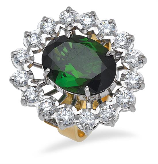 Centrally set with an oval cut green tourmaline of 9.27cts, surrounded by sixteen round brilliant cut diamonds totalling 2.59cts, mounted in 18ct gold, ring size N-O.