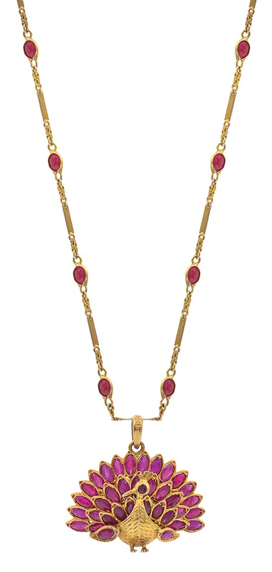 Set throughout with marquise cut rubies and suspended from a fancy link chain interspaced with oval cut rubies, all mounted in 14ct gold, total length 640mm.