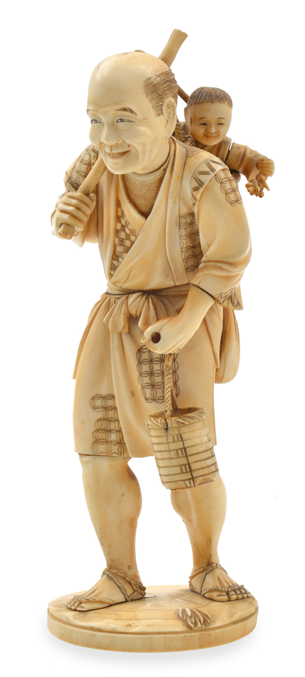 well carved ivory Okimono of a peasant man and small boy riding atop his back, 27.2cm high, (repaired, losses)